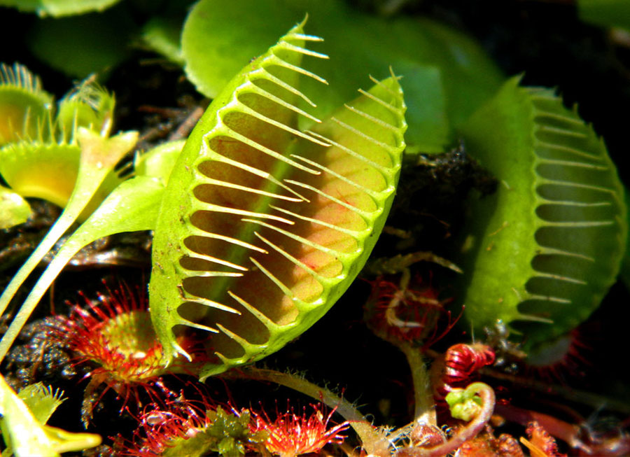 بسیاری از افراد هنگام صحبت از گیاه حشره خوار به یاد ونوس مگس خوار (Venus flytrap) میافتند. این گیاه در مردابهای سواحل شرقی آمریکا میروید و از جمله گیاهانی است که میتوان در گلخانه نیز پرورش داد. تله این گیاه از دو برگ تشکیل شده که مانند کفههای صدف باز و بسته میشوند. به محض اینکه حشرهای محرکهای درخشان این برگها را لمس کند، تله بسته میشود و تا زمان هضم حشره، بسته باقی میماند. این گیاه از آن دسته گیاهانی است که میتواند بشمارد یعنی ۳ عدد کرک در وسط تله گیاه تعبیه شده که با برخورد به عین این ۳ کرک تله بسته میشود حتی اگر دو کرک تکان بخورد هم بسته نخواهد شد. ازین جهت گیاه حرکات طعمه را میشمارد که از حضور و شکار وی مطمئن شود.