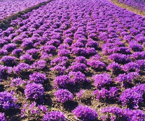 موقعی که گل ها ظاهر می شوند، مزرعه زعفران خوش منظره، معطر و به رنگ ارغوانی یا بنفش خوش رنگی در می آید و یکی از زیباترین چشم اندازهای طبیعت را زمانی می توان دید که مزرعه زعفران به گل نشسته است زیرا در آغاز سرما و خزان کلیه گیاهان که هیچ گلی در صحرا نیست گل می دهند.